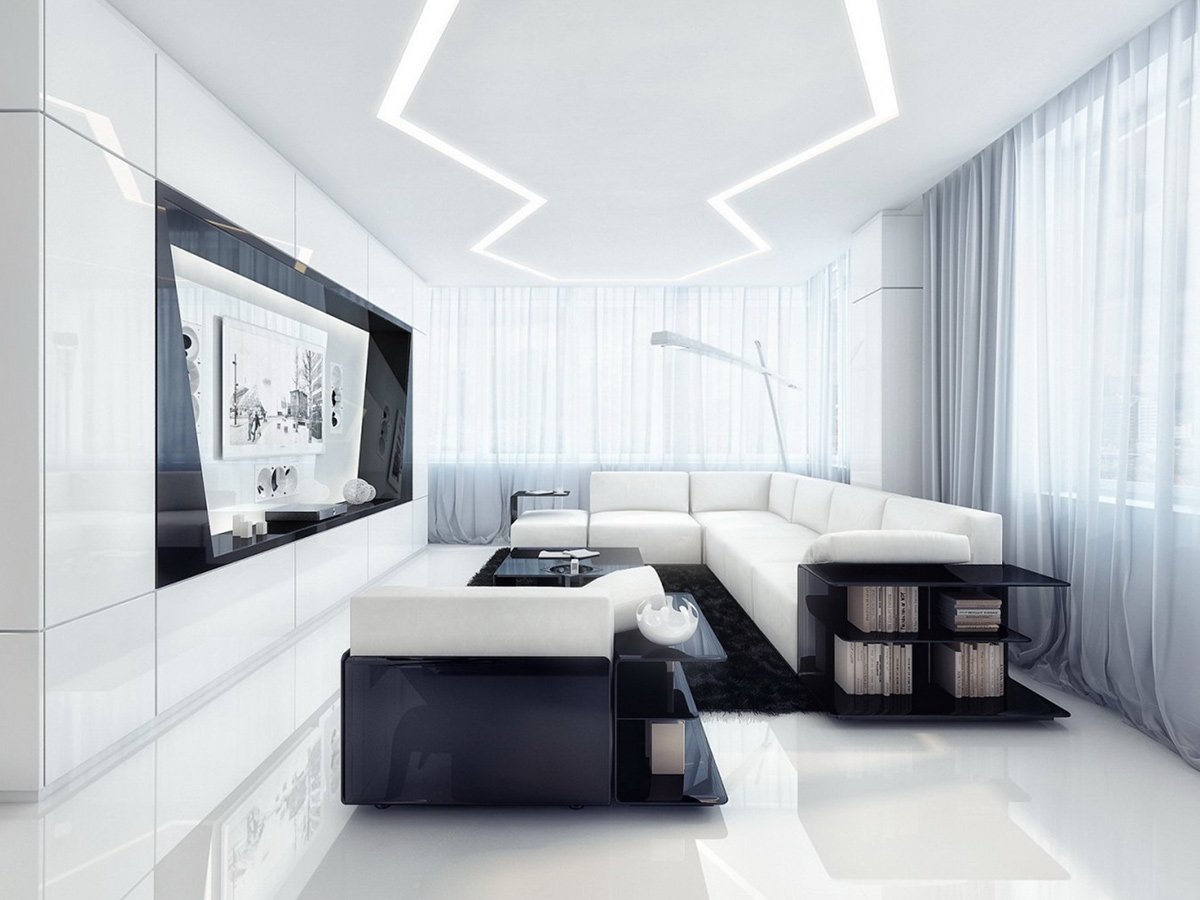 Designers almost always use this trick, because no color is capable of independently "pulling" the interior, if it is not emphasized by a pair of colors. For white, any shade of black, dark gray or brown plays this role perfectly. But do not forget that this is only an additional color and you should not go too far with it, because a large number of such colors can make the space too gloomy. The ideal solution would be to focus on a few pieces of furniture in dark colors, or focus on a dark floor.